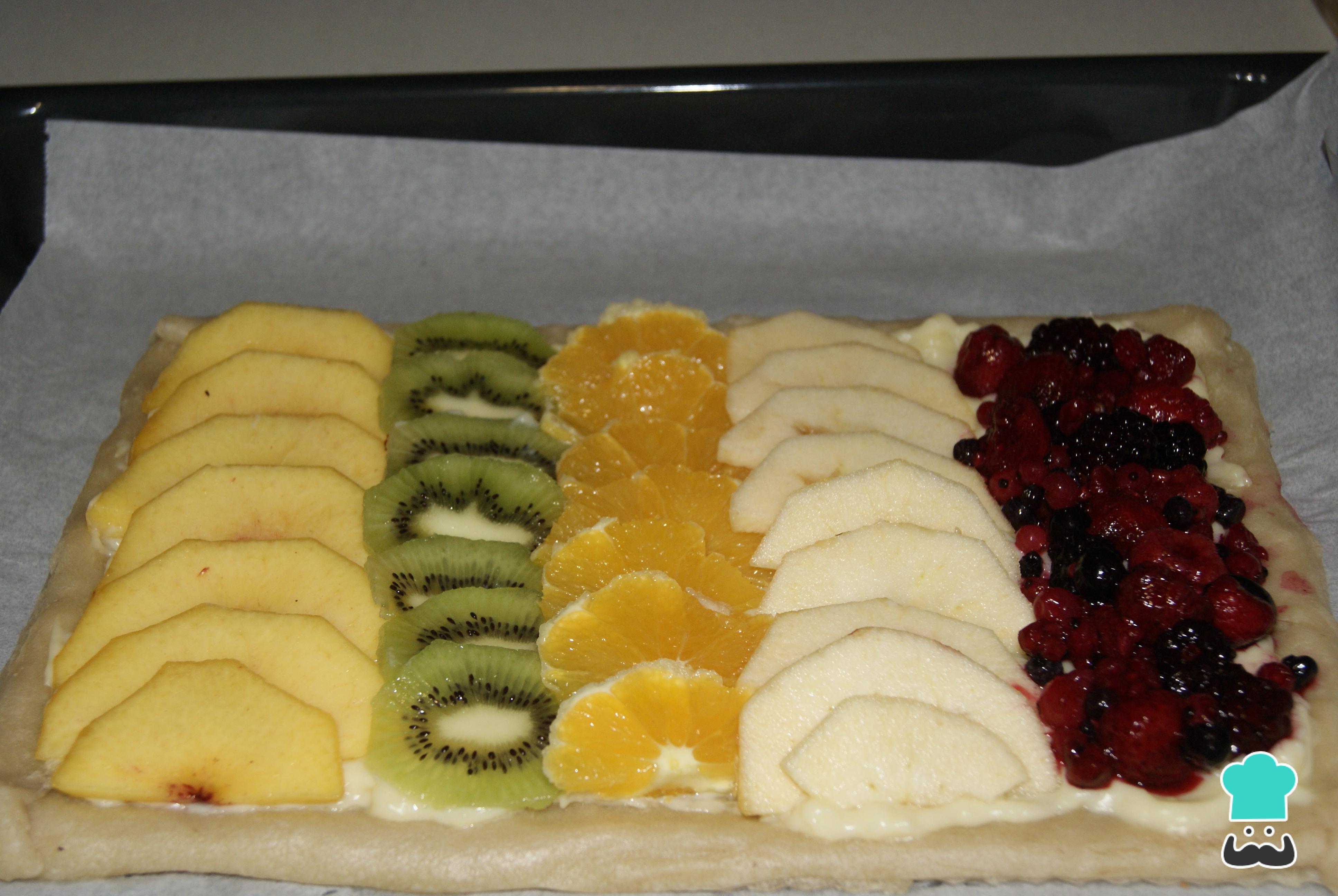 Espalhe o creme de confeiteiro sobre a massa - confira nossa receita de creme de confeiteiro fácil - e disponha as frutas como mostramos na fotografia. Leve de novo ao forno a 150ºC por 10-15 minutos.