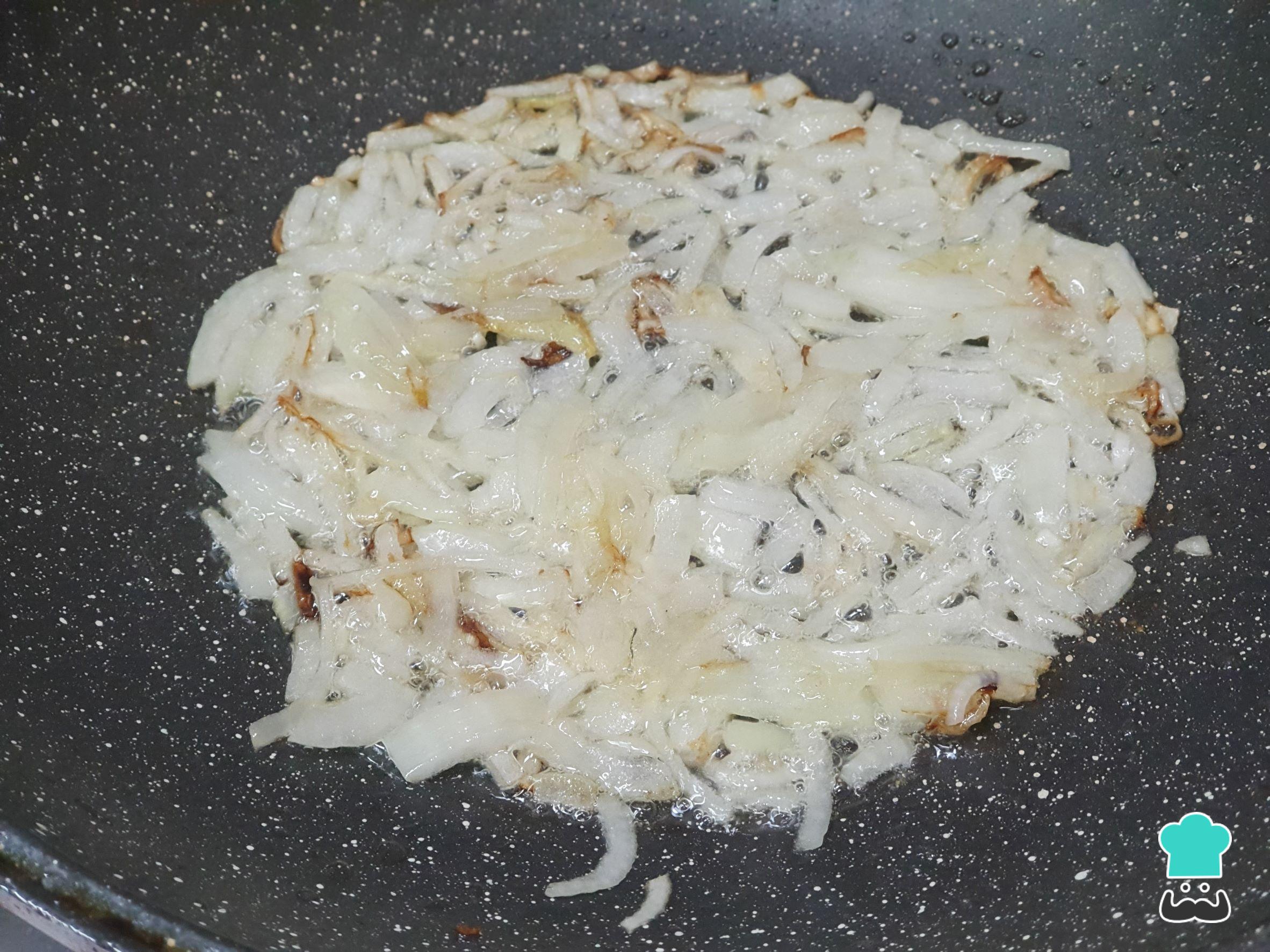 O primeiro passo para preparar esta receita de cogumelos com massa folhada é refogar a cebola em azeite até dourar, ela vai conferir mais sabor na torta!