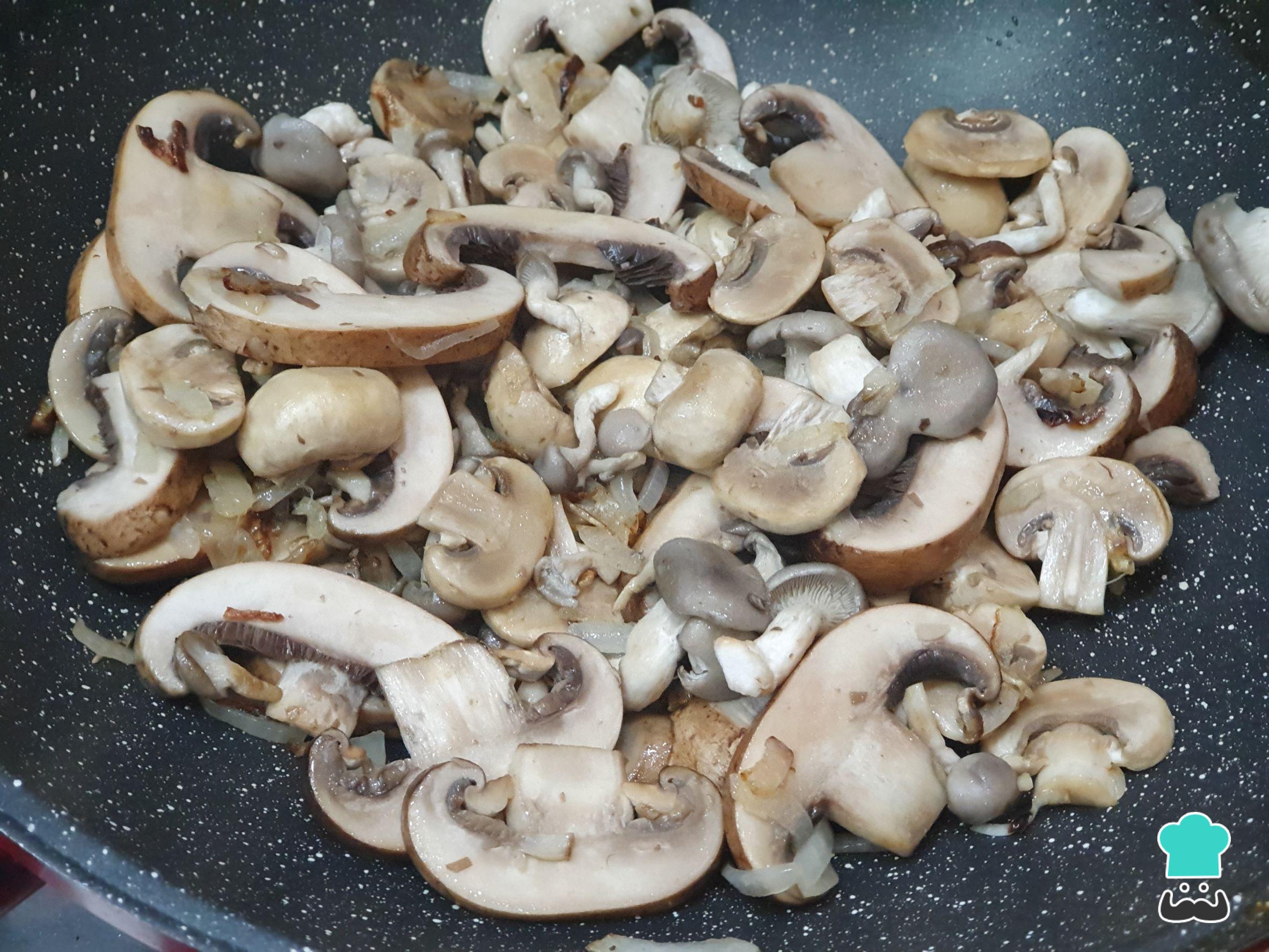 Refogue os cogumelos por 5 minutos, até que fiquem macios, e desligue o fogo. Pré-aqueça o forno a 200 graus.