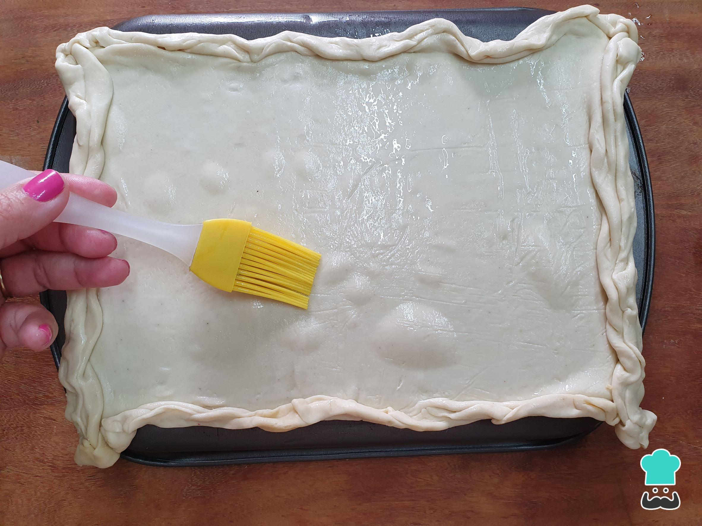 Em uma assadeira abra a massa folhada e dobre as bordas para dentro, formando uma barreira para que o recheio não caia. Com um pincel, pincele as bordas com as gemas e faça furos na massa com a ajuda de um garfo.