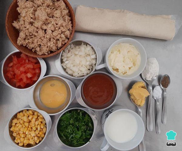 Separe todos os ingredientes necessários para preparar a receita da torta folhada de frango com catupiry. Siga as instruções da embalagem da massa folhada escolhida quanto ao preparo e manuseio da mesma. Deixe-a refrigerada até à hora que for montar a torta.