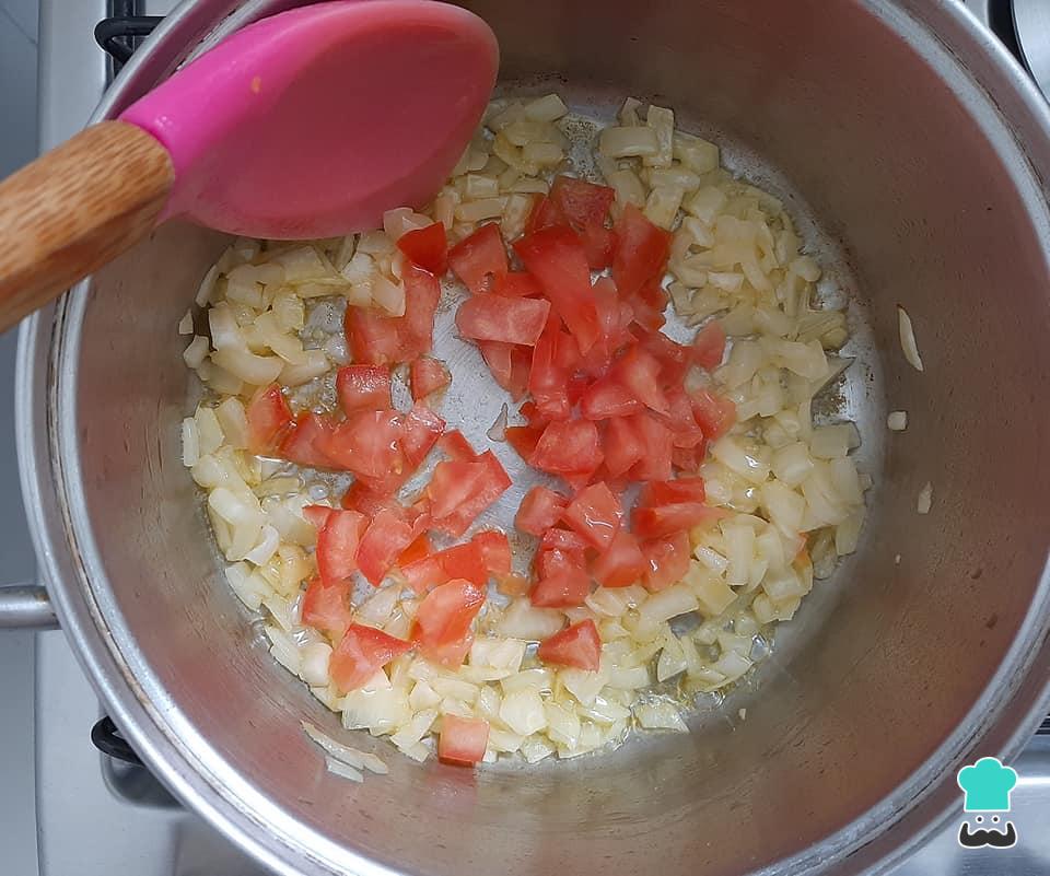 Prepare o recheio da torta com antecedência, pois este deverá ser usado para montagem quando estiver morno ou frio. Comece aquecendo a manteiga numa panela média, em fogo brando, e refogue a cebola picada por alguns minutos. Em seguida, adicione o tomate picado refogando-o também.