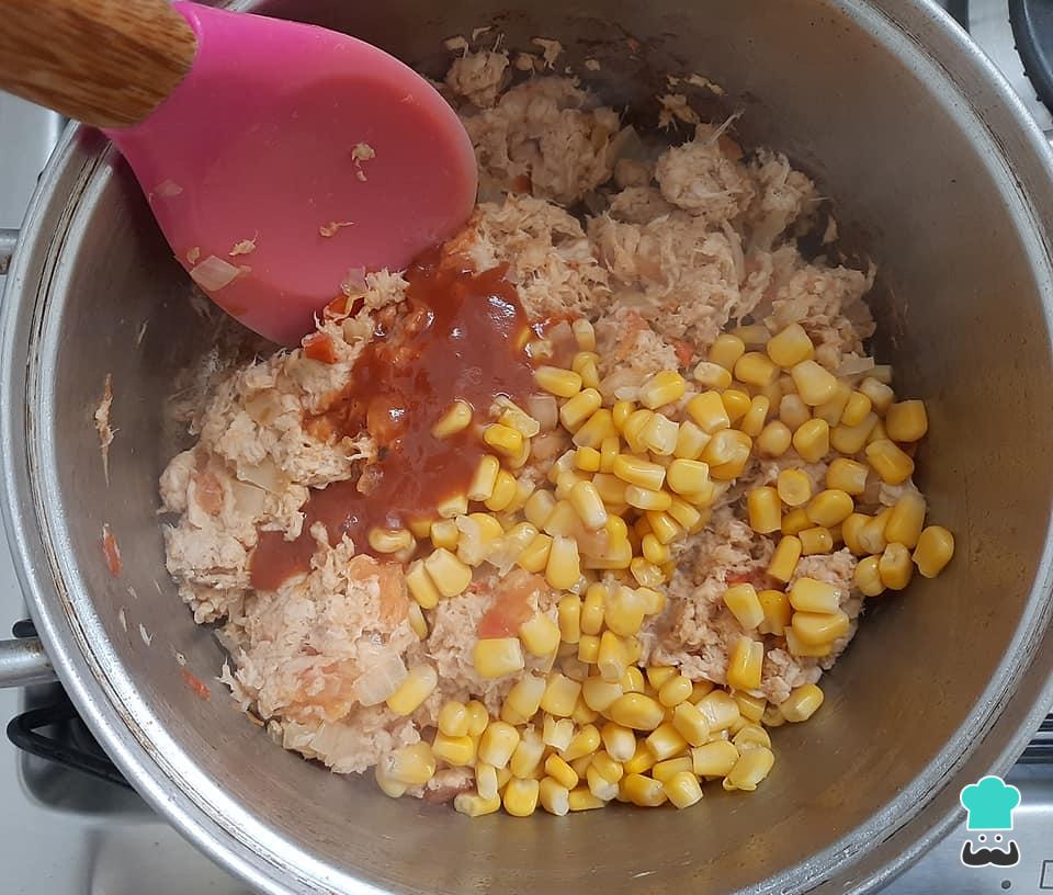 Adicione o frango cozido e desfiado e refogue um pouco. Logo em seguida acrescente ao refogado o milho verde, o molho de tomate, o sal e a pimenta do reino.