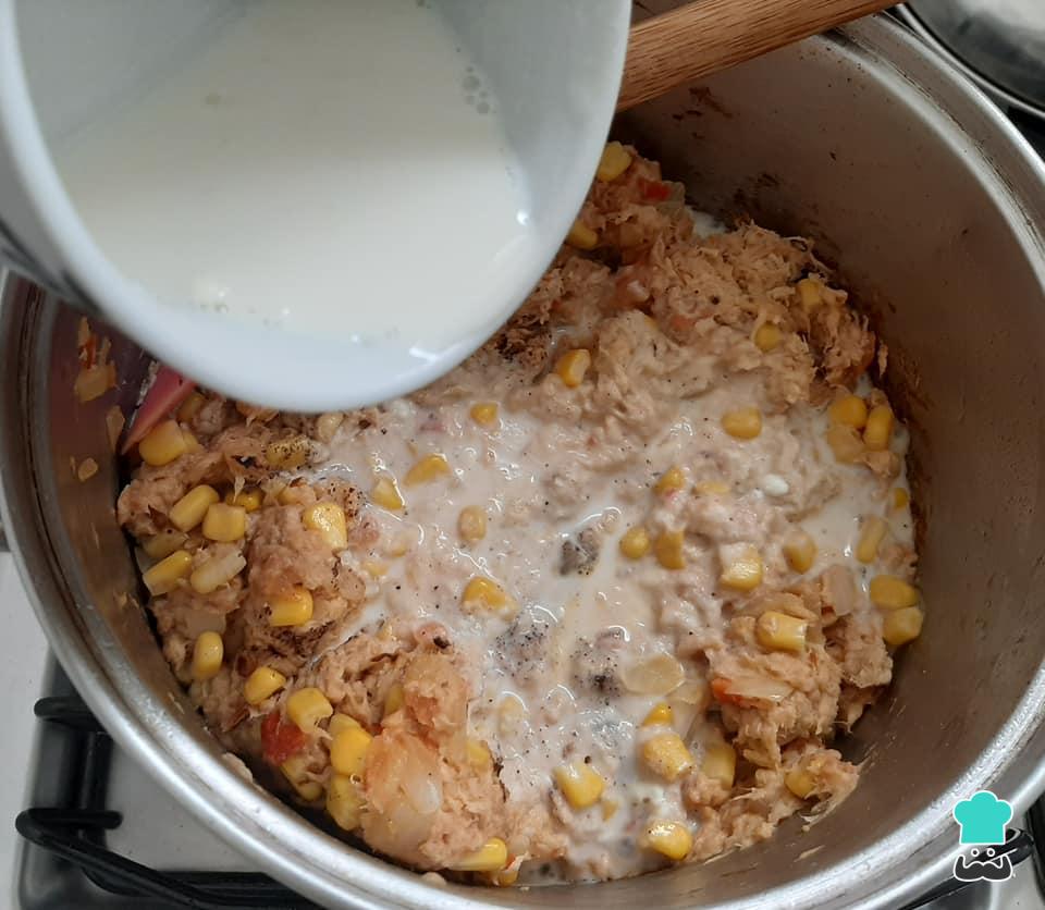 Dilua a farinha de trigo no leite líquido e junte ao refogado, mexendo sempre até ganhar uma consistência mais cremosa.