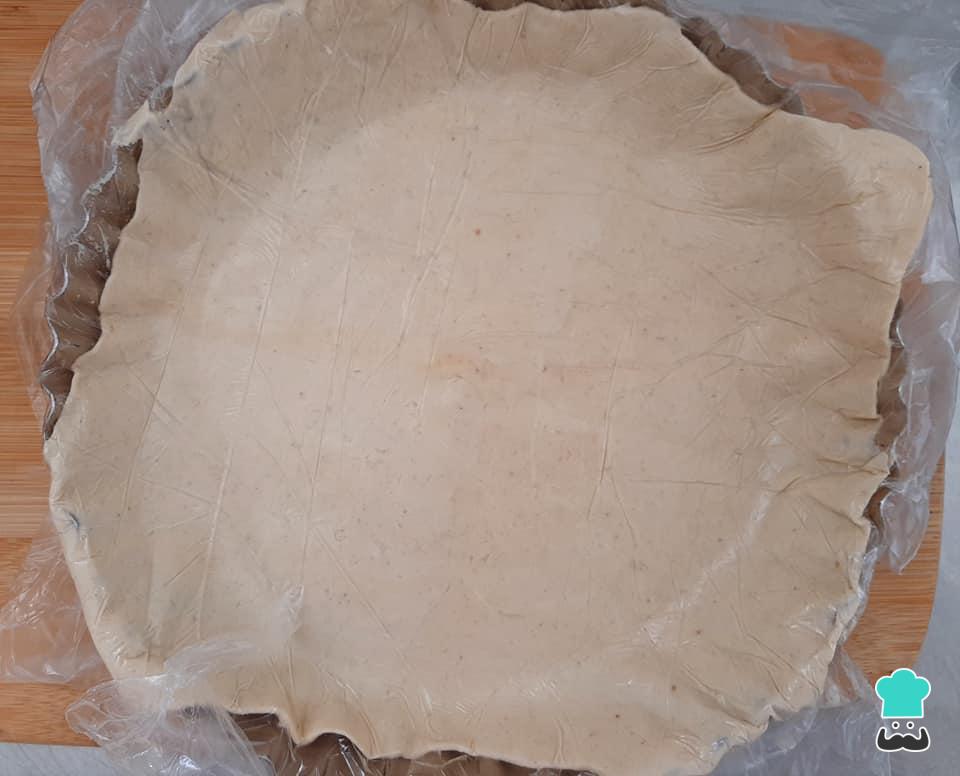 Abra metade da massa dentro de uma forma redonda levemente untada com margarina ou manteiga. Ajuste a massa até cobrir a lateral da forma. Reserve a massa restante para a decoração.