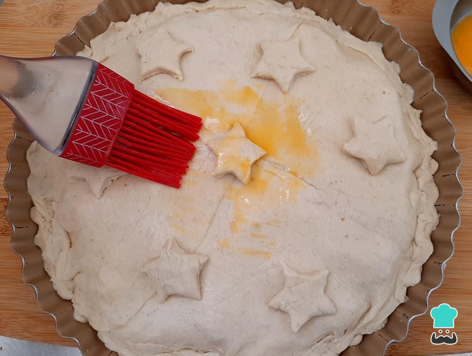 Feche as bordas pressionando com os dedos ou com o auxílio de um garfo. Com a massa restante, faça a decoração que desejar e, em seguida, pincele uma gema por toda a superfície da torta. Leve a torta para a geladeira por 30 minutos antes de assá-la. Asse a torta a 180 graus por 30 a 40 minutos ou até ela dourar levemente.