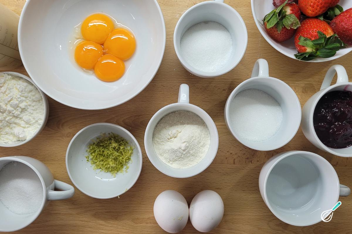 Separe os ingredientes para fazer sua torta fraisier. Esta fase da receita é chamada de mise en place, que consiste de deixar todos os ingrediente separados e nas medidas corretas para facilitar o preparo e não se esquecer de nada.