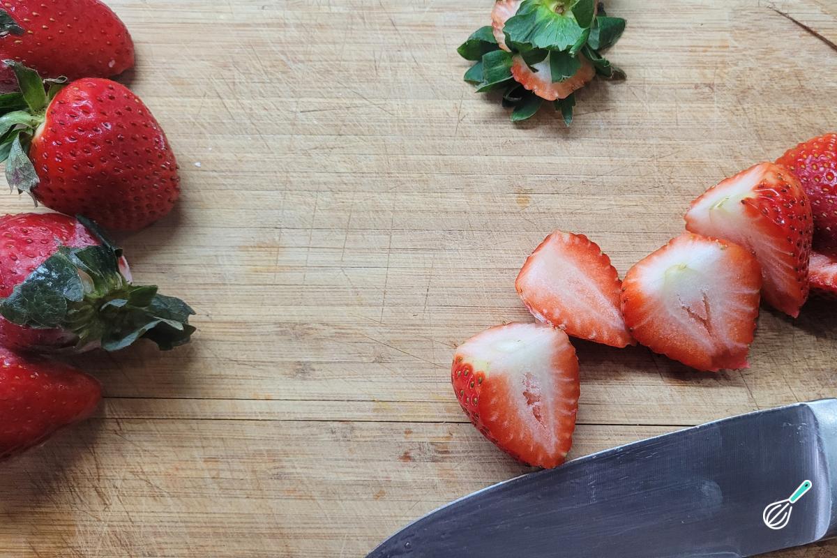 Lave bem os morangos, retire as folhas e corte cada um ao no sentido do comprimento.