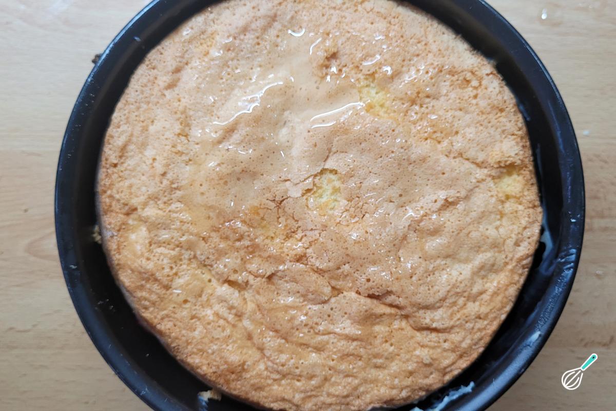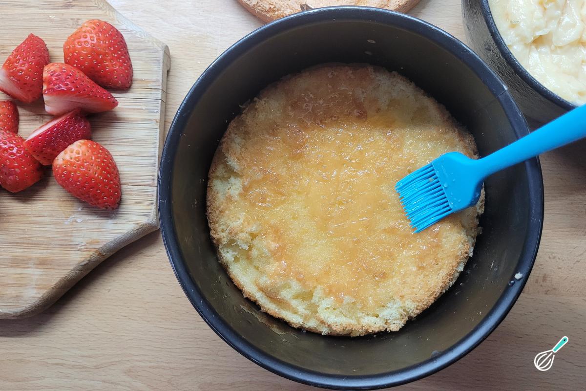 Para a montagem, você pode usar um acetato ou mesmo uma forma de fundo removível para dar estrutura (usei a mesma forma que usei para assar o bolo). Coloque uma das metades da massa no fundo e pincele generosamente com a calda, deixando molhar as laterais da massa.