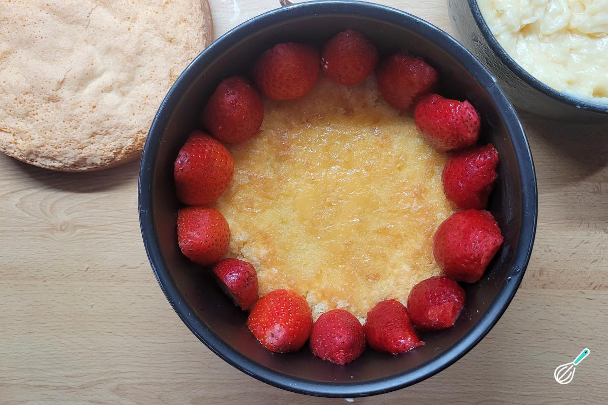 Disponha os morangos sobre a massa, deixando a parte cortada para fora para que fique uniforme ao desenformar.