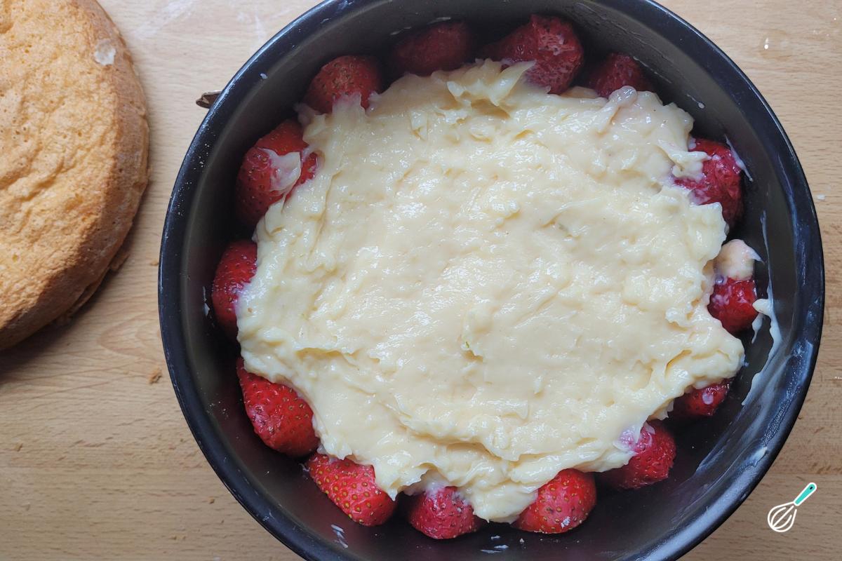 Retire o creme de confeiteiro da geladeira. Como ele deve ter engrossado bastante, dê uma batida com uma espátula ou batedor de arame para aerar. Espalhe cerca de 3/4 do creme sobre a massa e os morangos, reservando o restante para cobrir.