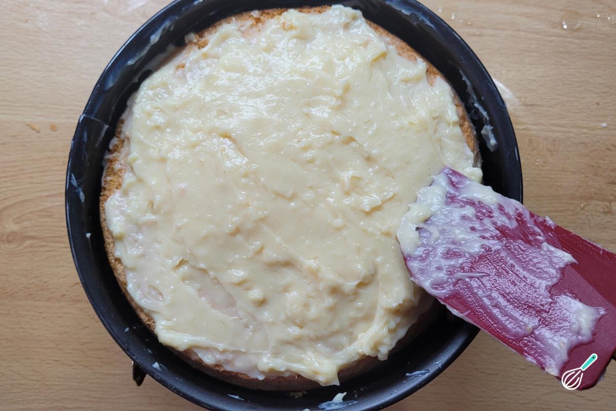 Cubra com o restante do creme de confeiteiro e leve à geladeira por cerca de 4 horas até que fique bem firme.