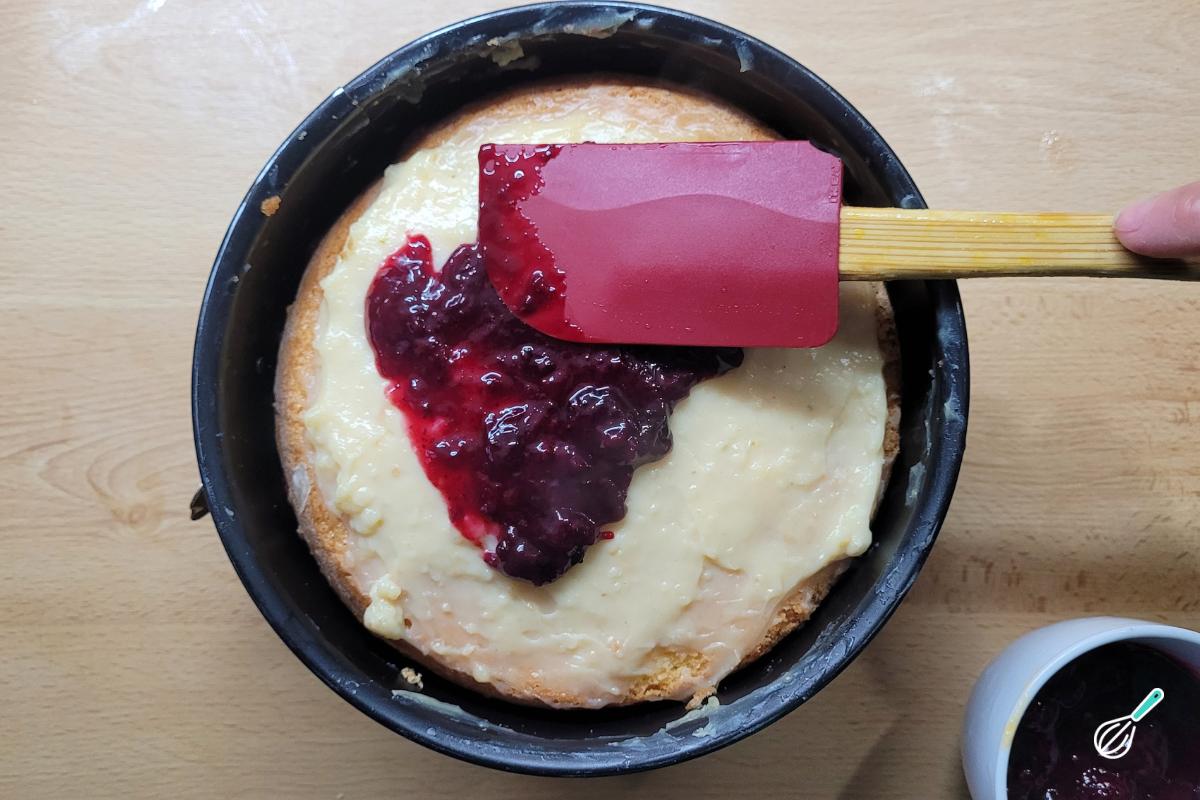 Depois deste tempo, esquente a geleia no micro-ondas por cerca de 30 segundos para que fique mais fluida e mais fácil de espalhar sobre o bolo. Sem retirar o aro da forma ou acetato, espalhe na superfície e leve novamente à geladeira por cerca de 1 hora.