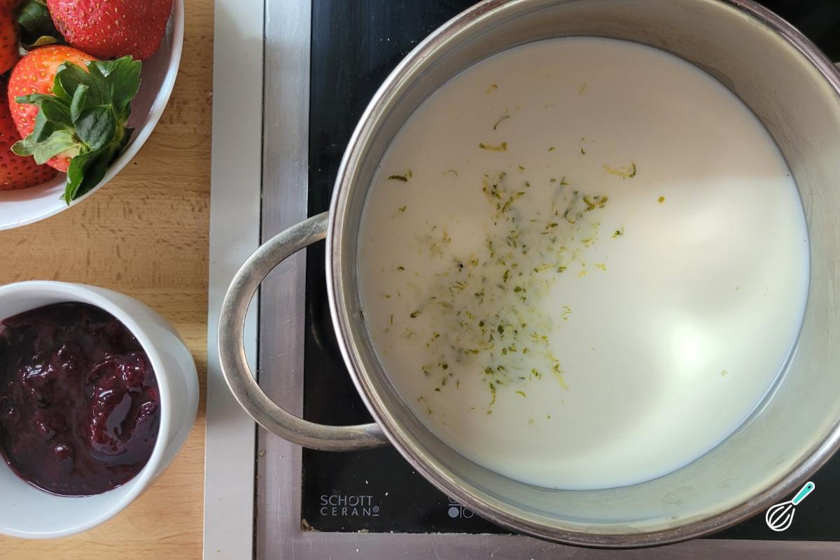 Vamos começar pelo creme de confeiteiro do recheio porque ele precisa esfriar antes de rechear o bolo. Leve o leite para uma panela junto com as raspas de limão para esquentar, sem deixar ferver. Tradicionalmente nesta receita, se usa fava de baunilha para infusionar o leite, mas substituí por raspas de limão, porque acho que a acidez combina bem com os morangos.