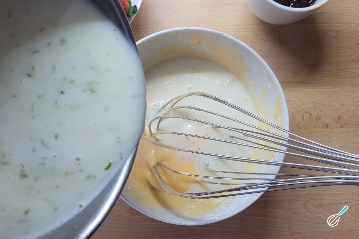 Junte cerca de metade do leite infusionado à mistura de gemas e açúcar, sempre mexendo. Isso serve para temperar os ovos, deixando na mesma temperatura do leite, evitando que coagulem ao irem para a panela.