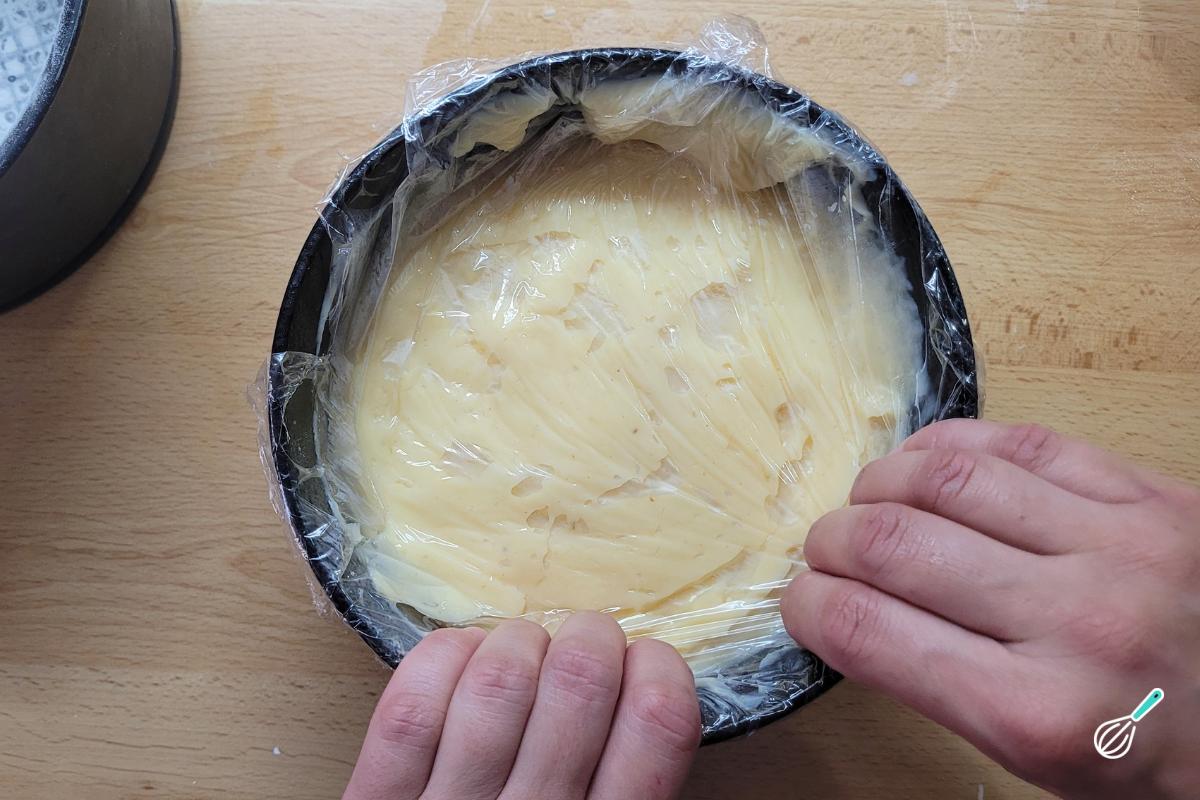 Transfira a mistura para uma tigela e cubra com plástico filme para evitar que forme uma película na geladeira. Leve à geladeira e deixe esfriar totalmente enquanto prepara o bolo e a calda.