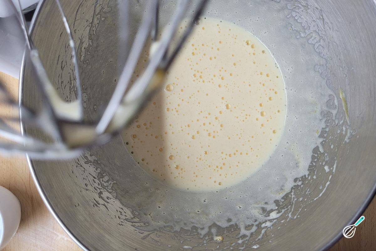 Enquanto isso, bata muito bem as gemas com o açúcar e o amido de milho até que forme uma mistura aerada de cor clara. Como tem bastante amido, a mistura fica um pouco mais pesada. É assim mesmo.