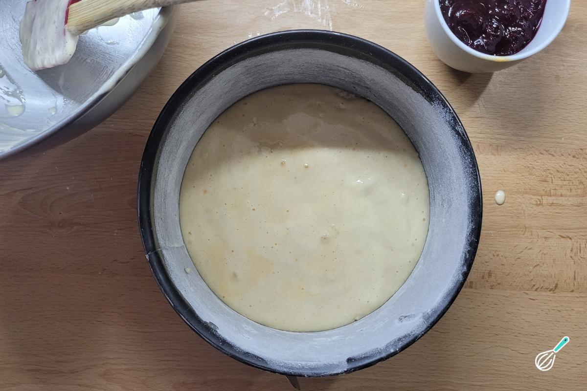 Coloque a mistura em uma forma untada e enfarinhada e leve ao forno a 180oC até que o bolo esteja assado. Usei uma forma de fundo removível para ficar mais fácil de desenformar depois.