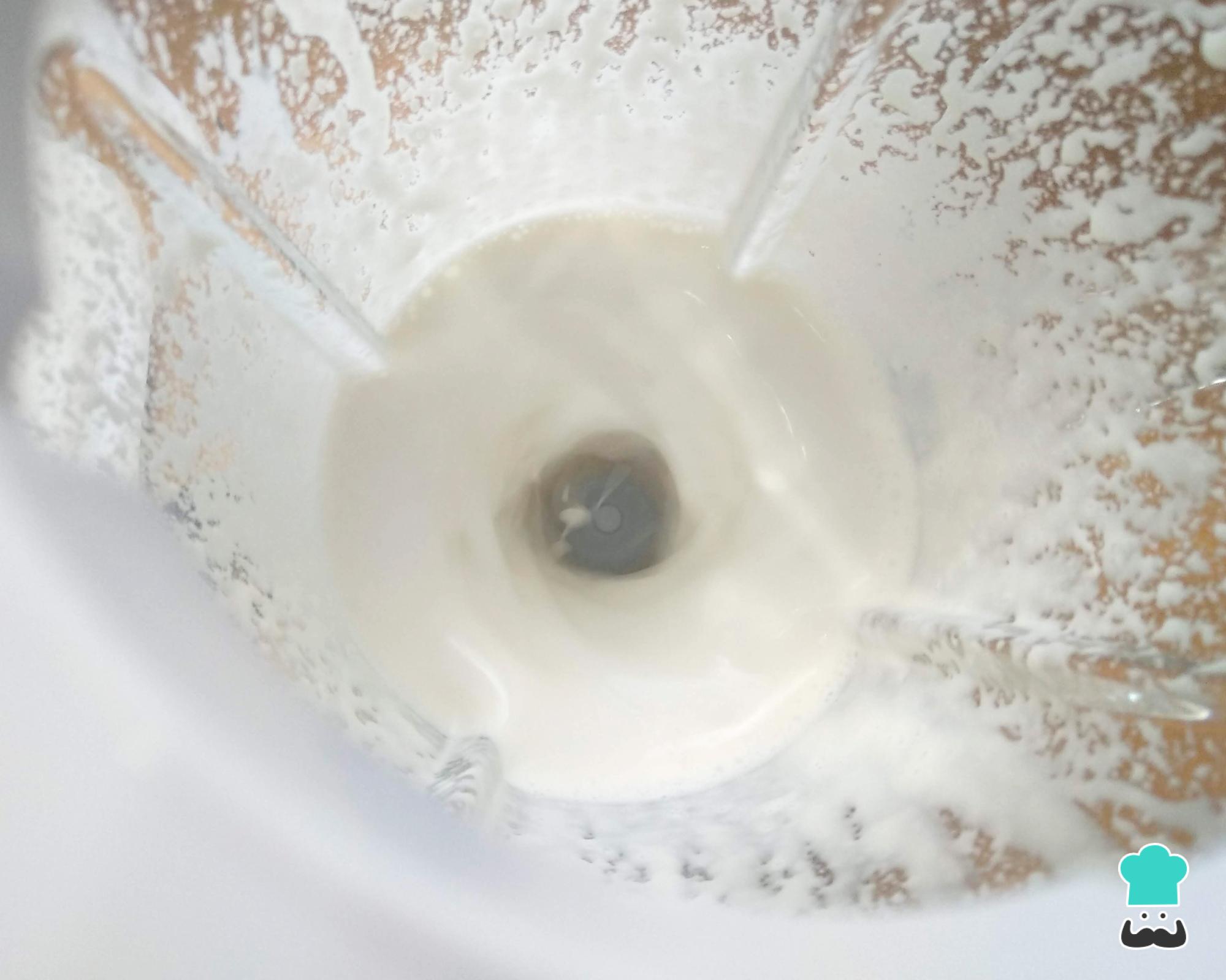 Enquanto o creme anterior esfria, bata o creme de leite no liquidificador até ficar cremoso e consistente. Adicione o restante açúcar (2 colheres de sopa) e volte a bater.