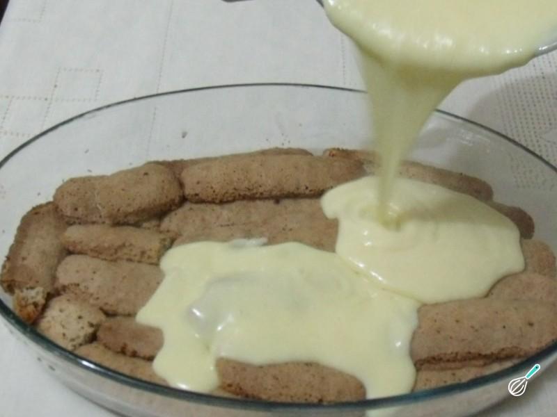 Molhe o biscoito champanhe no leite e coloque-o sobre o creme. Despeje a outra metade do creme no topo e leve a torta de cupuaçu à geladeira até firmar.