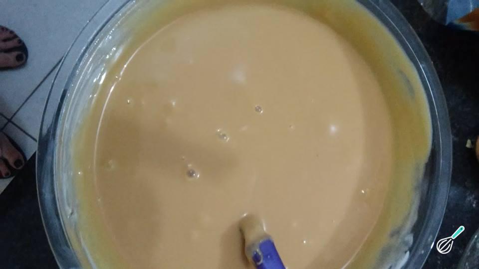 Para fazer uma torta gelada de doce de leite, coloque o creme de leite e o doce de leite em uma vasilha. Mexa tudo com uma espátula até obter uma mistura uniforme e consistente.