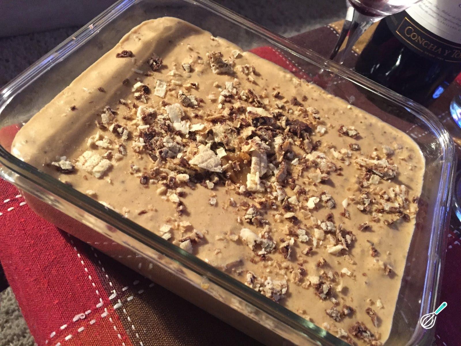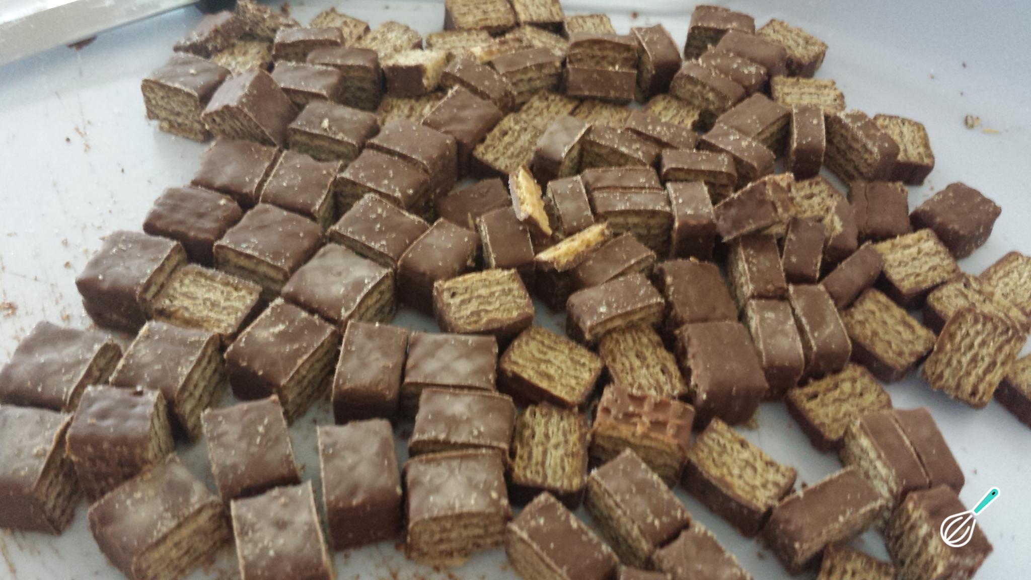 De seguida, corte o Bis em cubinhos e coloque no fundo da travessa. Cubra tudo com a mistura do passo anterior e leve ao freezer por algumas horas até solidificar.