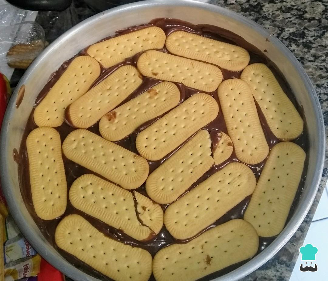 Coloque um pouco do brigadeiro no fundo de uma forma com fundo removível e, sobre ele, arrume algumas bolachas formando uma caminha. Repita até ao topo.