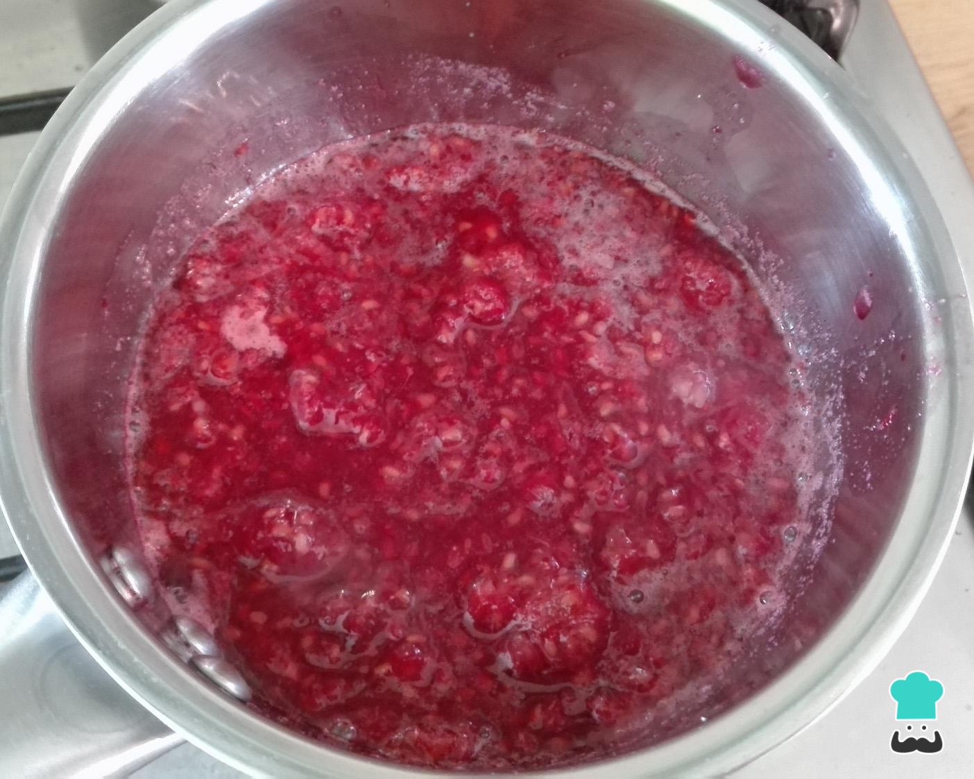 Finalmente, para decorar a torta, coloque a geleia em uma panela e adicione 3 colheres de sopa de água. Leve ao fogo até obter uma calda rala e deixe esfriar.