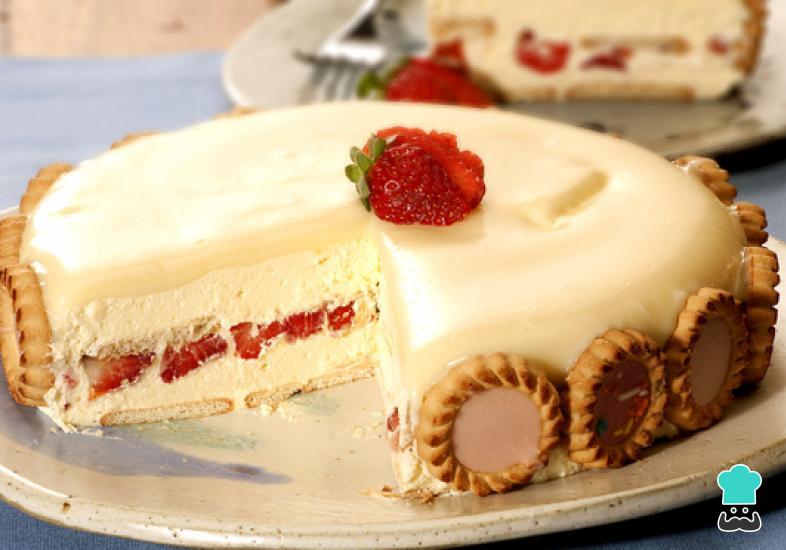 Para fazer a cobertura, cozinhe o chocolate branco picado e o creme de leite em banho-maria e mexa bem até obter uma mistura lisa. Quando esfriar, espalhe sobre o doce gelado (incluindo as laterais). Grude os biscoitos na lateral da torta e decore com morango.