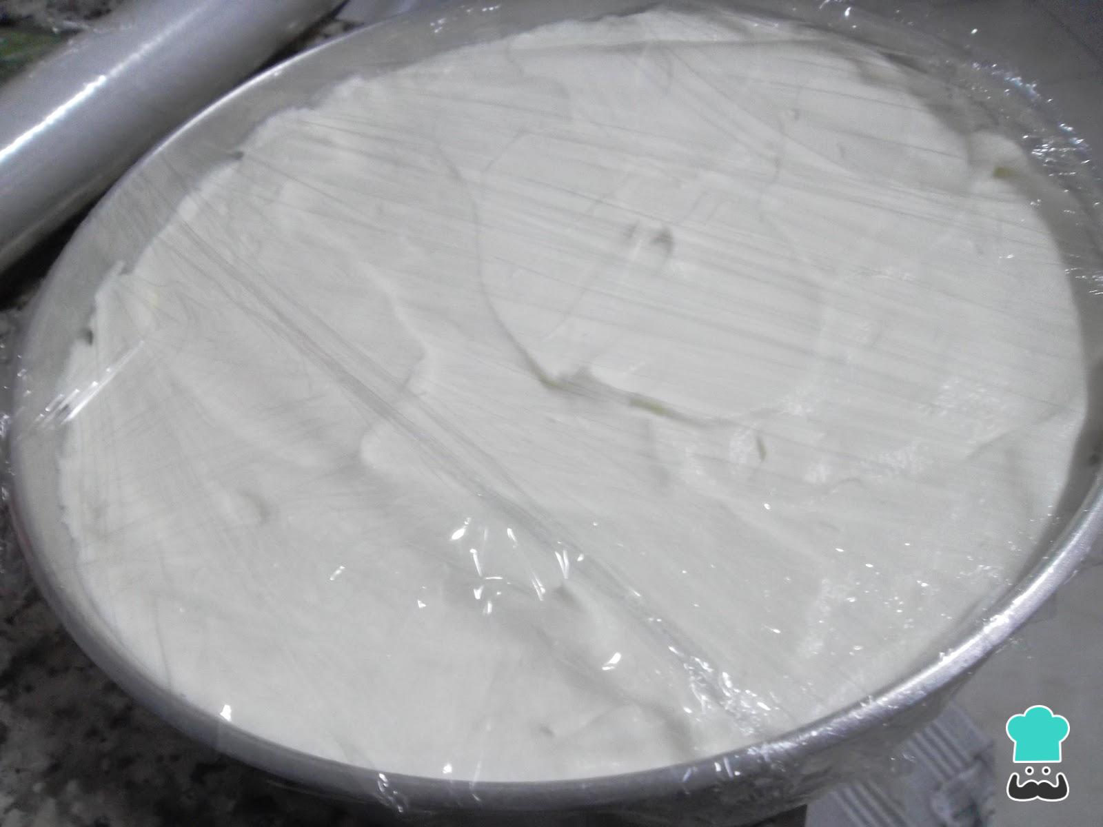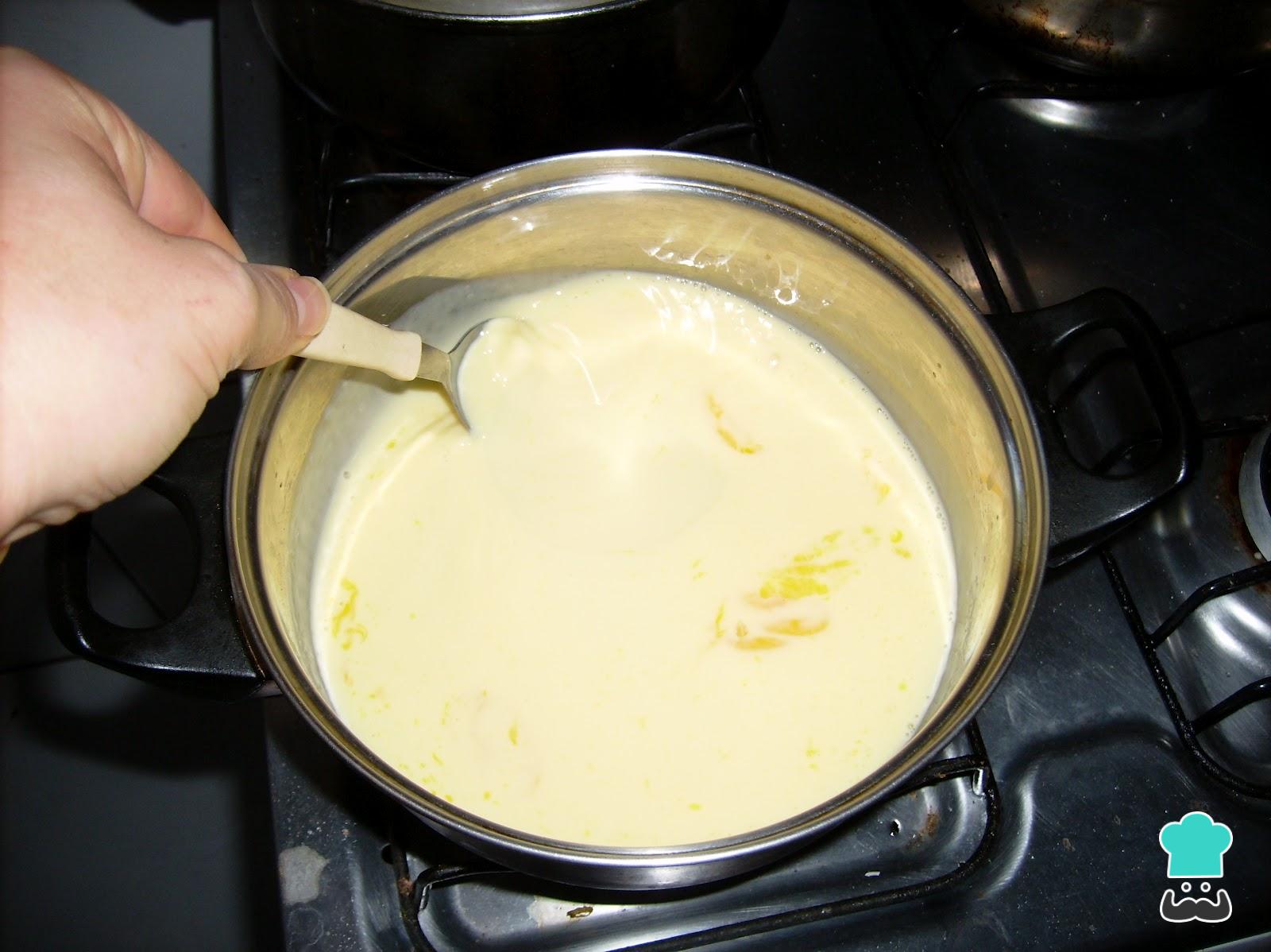 Para fazer torta holandesa com chocolate branco, comece por colocar o leite condensado, o leite, as gemas de ovo peneiradas e o amido em uma panela. Cozinhe até obter um creme. Desligue o fogo, incorpore a baunilha e deixe esfriar.