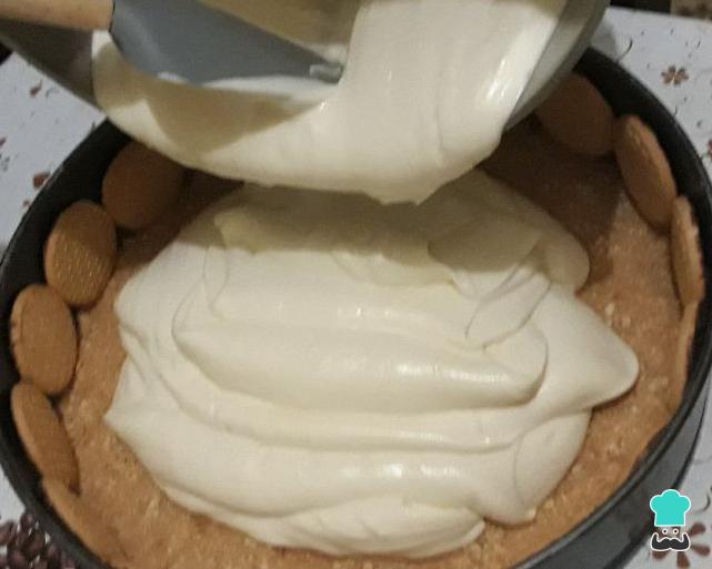 Agora pegue a forma forrada com a farofa de biscoito e manteiga e coloque o creme espalhando bem. Leve a forma novamente à geladeira, para que o creme fique mais consistente.