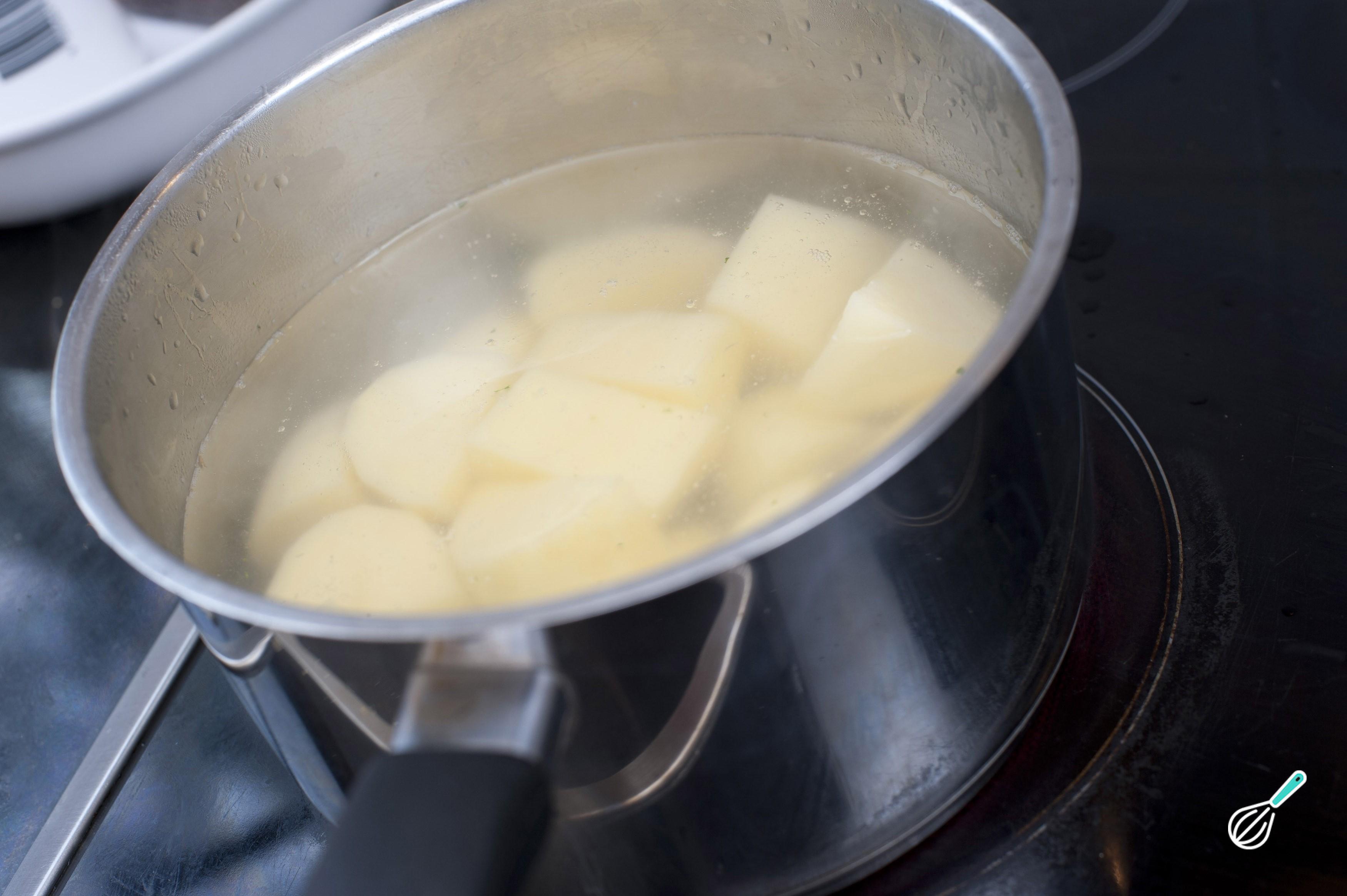 Comece por descascar as batatas, cortar em pedaços e cozinhar numa panela com água e um pouco de sal até que fiquem macias, desfazendo.