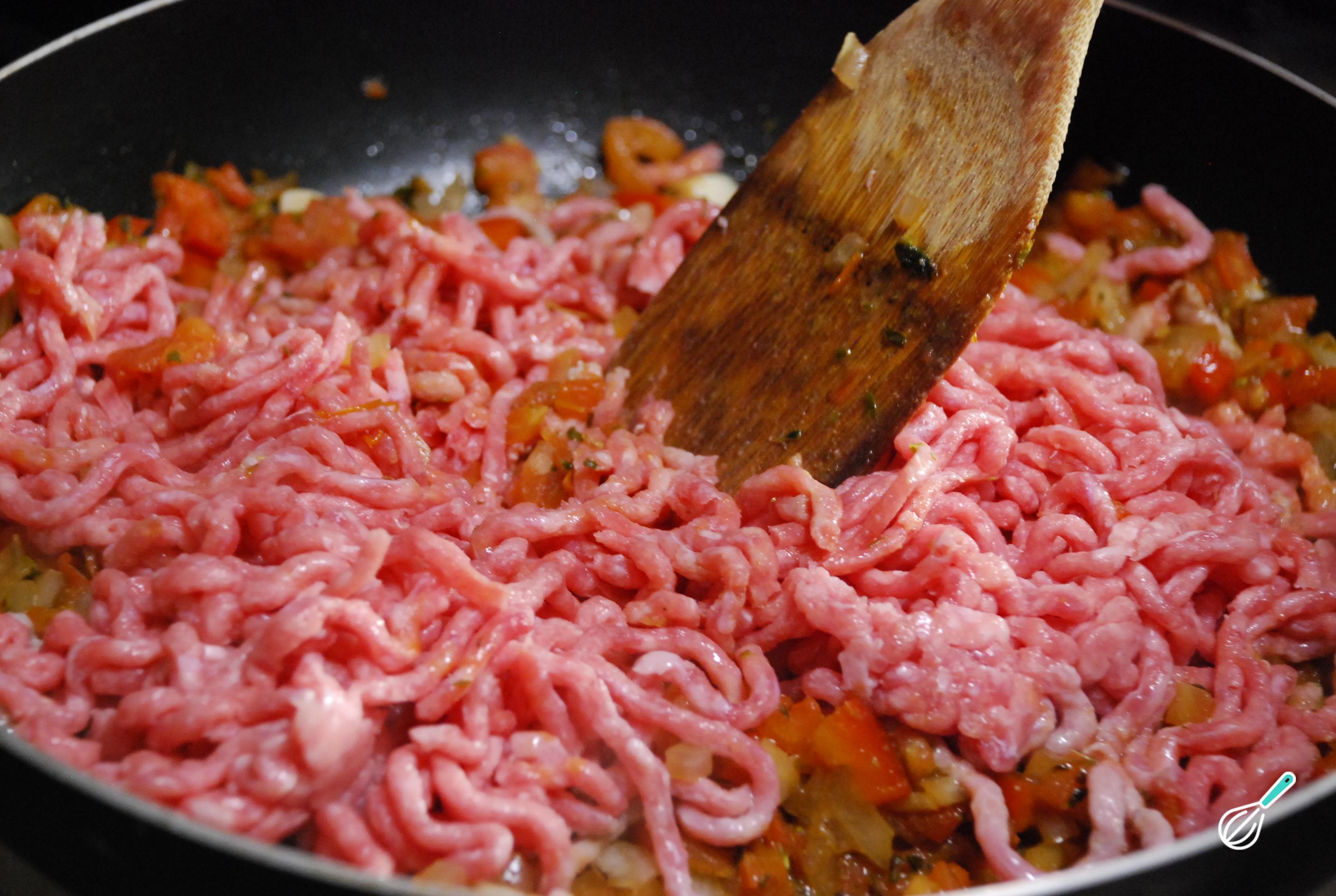 Acrescente a carne e cozinhe, mexendo, até ficar soltinha. Depois tempere com sal e pimenta, acrescente o molho inglês e continue cozinhando por mais 10 minutos ou até a carne estar pronta. Este é o recheio da torta Madalena de carne moída, por isso deve ficar bem saboroso! Quando estiver ao seu gosto desligue e reserve.
