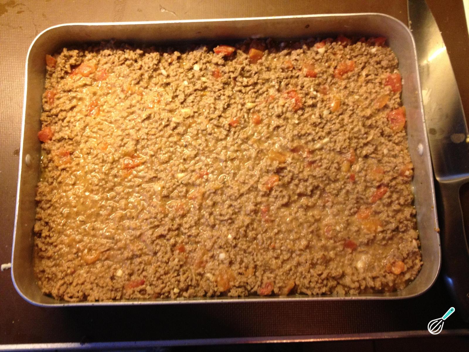 Para montar esta receita de torta Madalena de carne moída unte uma assadeira e espalhe no fundo metade do purê de batata. Depois acrescente a carne, espalhando bem sobre todo o purê, e cubra com o purê restante.