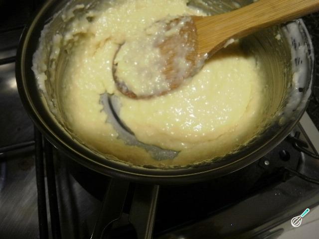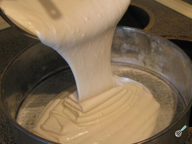 Em seguida acrescente pouco a pouco a farinha peneirada e o leite de coco intercalados, mexendo com uma colher ou fouet. Por fim adicione o fermento e misture ligeiramente.