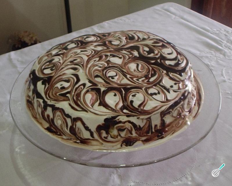 Termine de decorar a torta mesclada gelada: dissolva o chocolate em pó na água e pingue várias gotas em redor de todo o bolo. Passe um palito nas gotas de calda de chocolate e faça desenhos no bolo misturando essa calda com o merengue. Reserve na geladeira por 1-2 horas e sirva. Temos a certeza que este bolo decorado fará o maior sucesso!