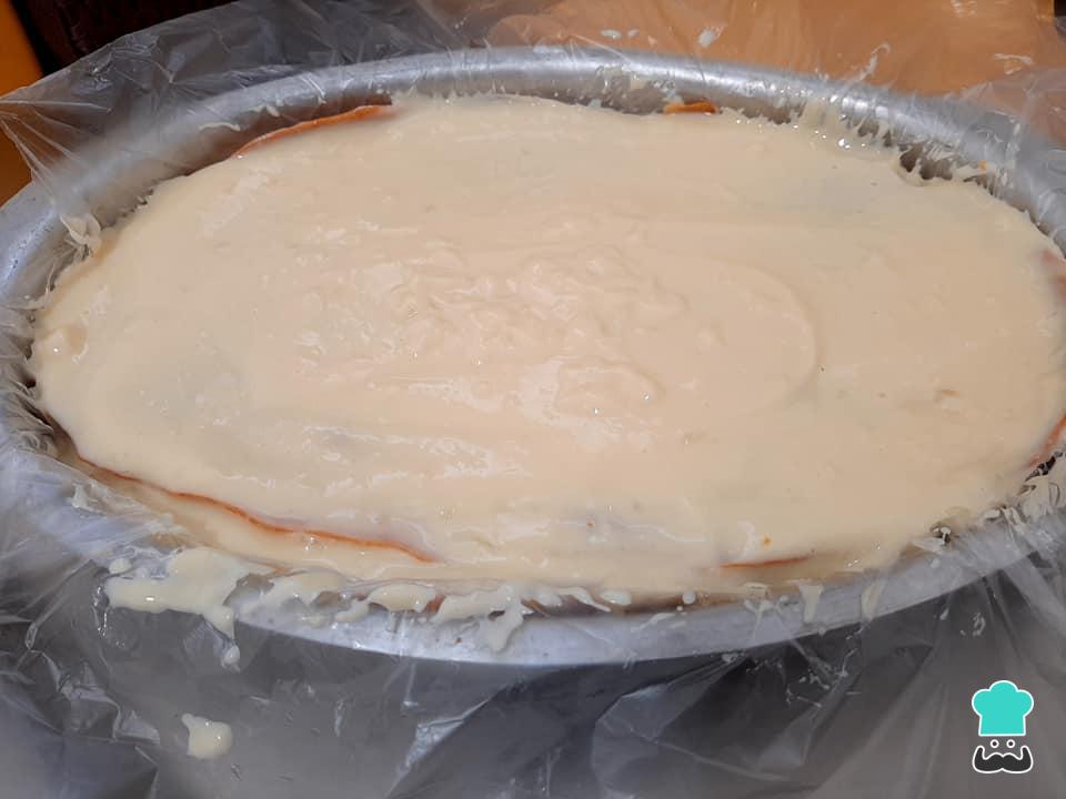 Com a torta montada, cubra a superfície com o plástico filme ou papel alumínio e leve à geladeira por, no mínimo, 12 horas para firmar o doce.