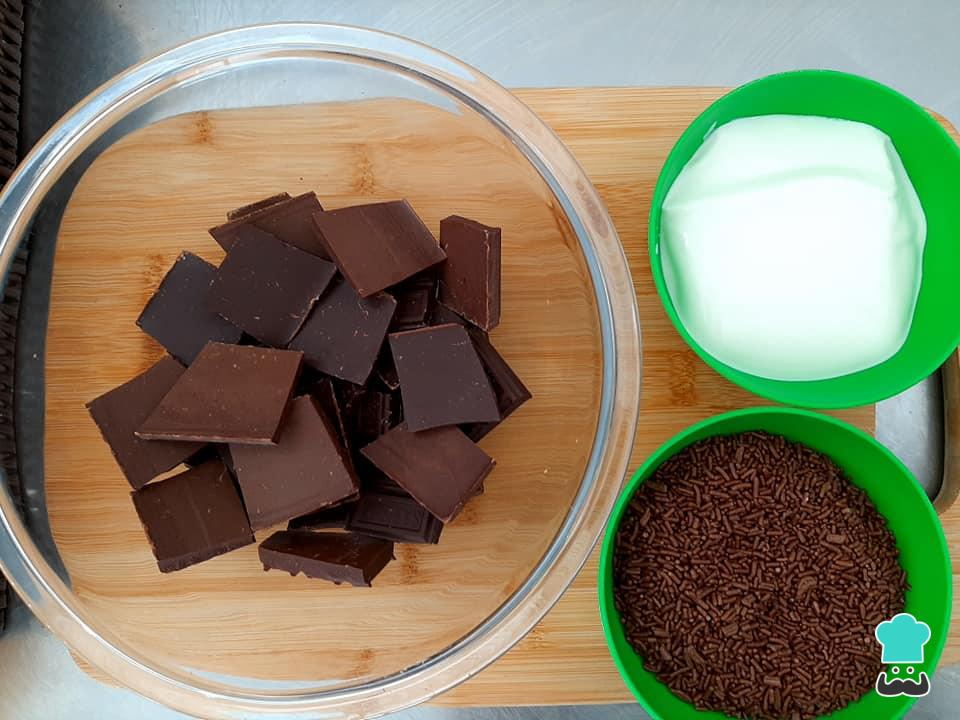 Após esse tempo de repouso, ou seja, no dia seguinte, separe os ingredientes da ganache para fazer a cobertura da torta.