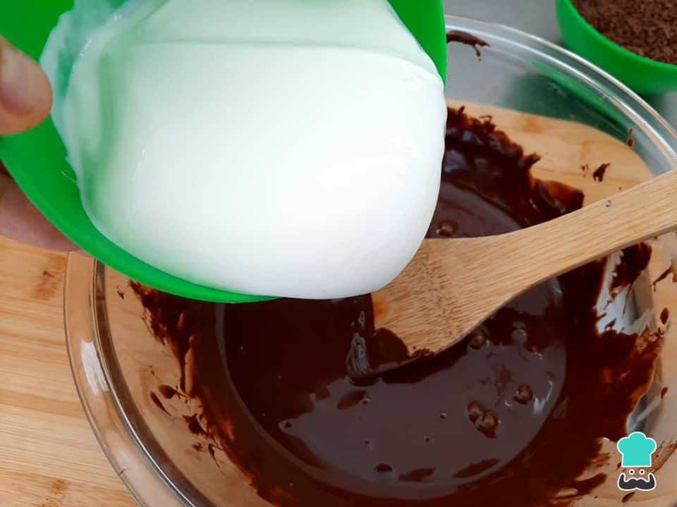 Derreta o chocolate em banho-maria ou no microondas e misture o creme de leite, até que a ganache fique lisa e homogênea. Espere esfriar um pouco para desenformar a torta e cobrir.