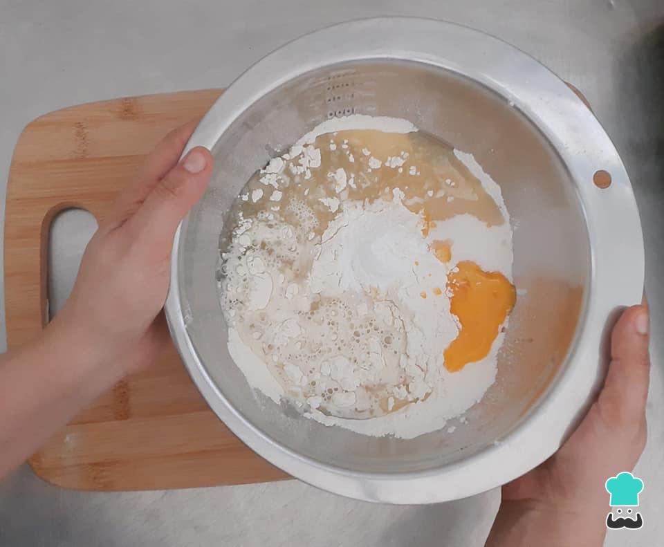 Numa tigela, coloque todos os ingredientes da massa: a farinha de trigo peneirada, a gema, o óleo, a água morna, o sal, o açúcar e o fermento em pó.