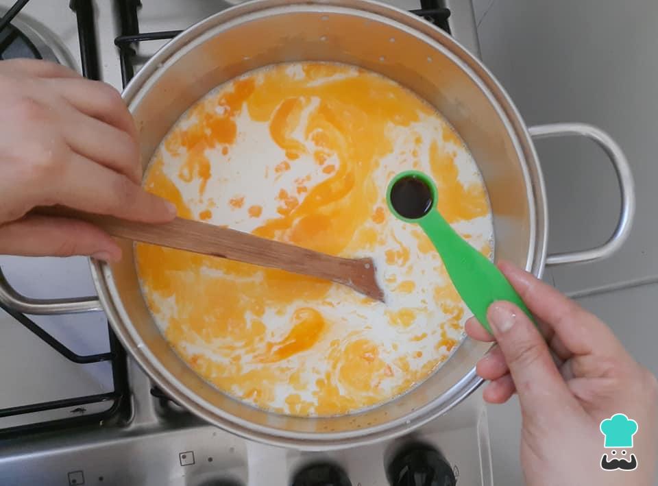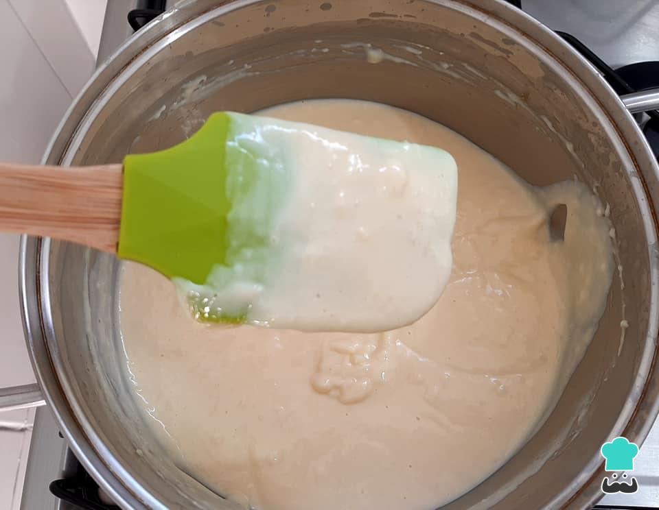 Deixe o creme cozinhando em fogo brando até que comece a engrossar, com textura de mingau, conforme mostra a foto abaixo. Reserve o creme, deixando-o esfriar para dar continuidade à receita.
