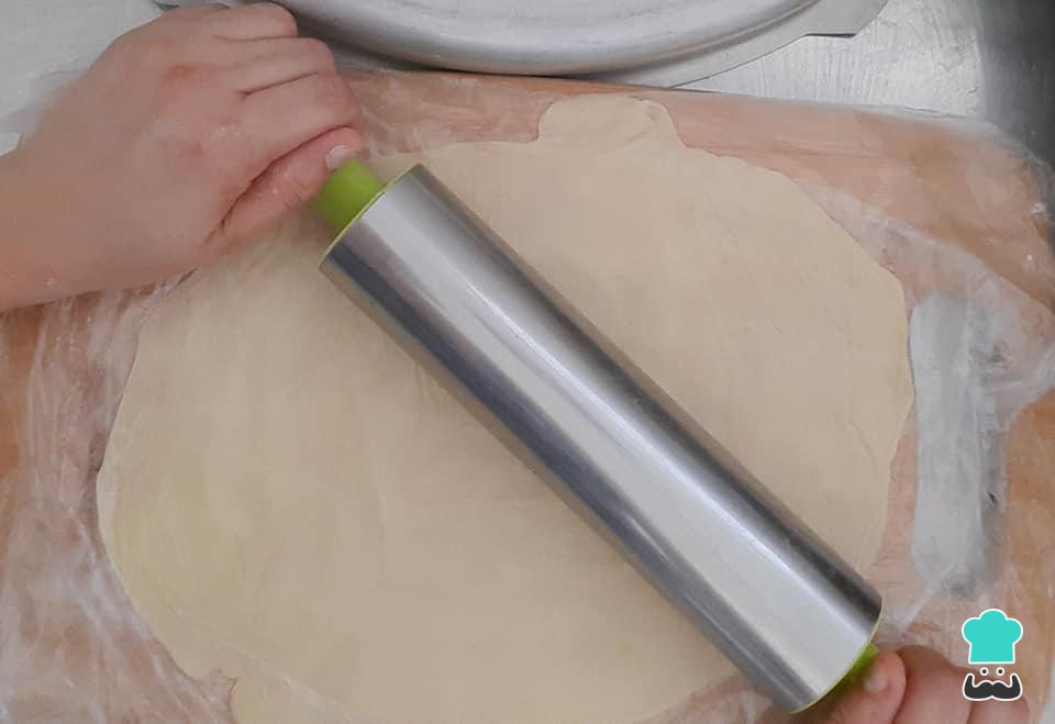 Abra cada porção de massa com o auxílio de um rolo. Ela deverá ficar bem fina por isso, para facilitar, abra-a entre dois sacos, como na foto.