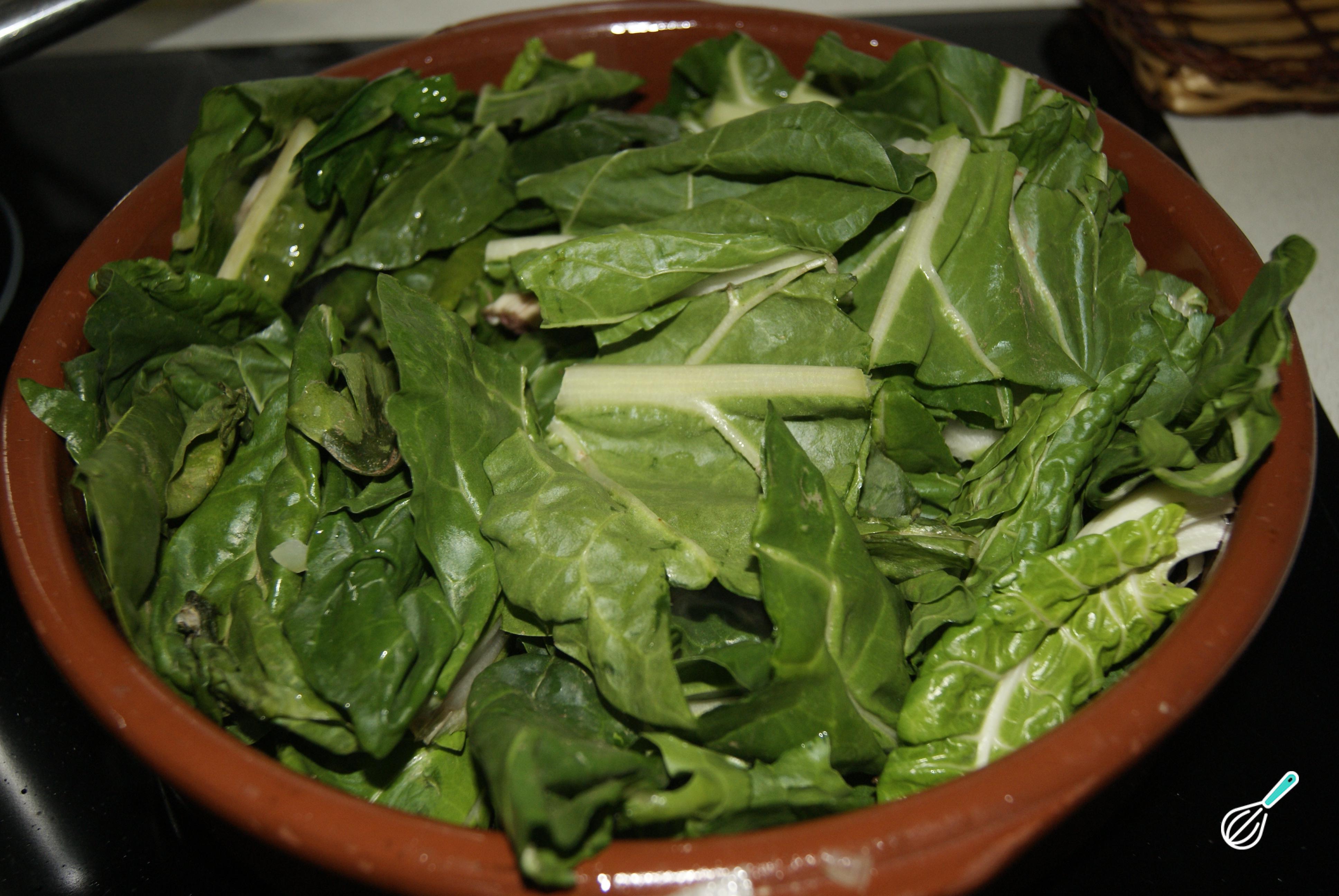 Refogue as folhas de acelga em uma panela com um pouco de azeite.