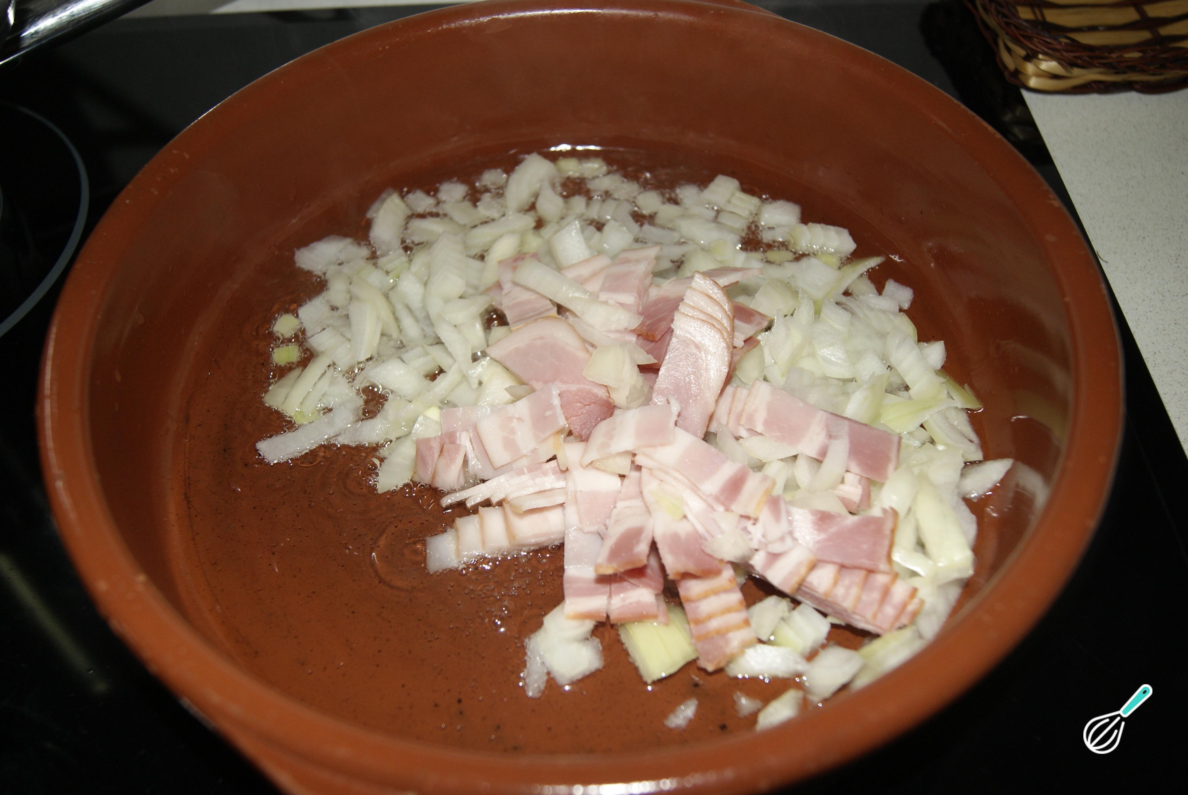 Enquanto isso, pique a cebola e o bacon e refogue os dois ingredientes no azeite de oliva.