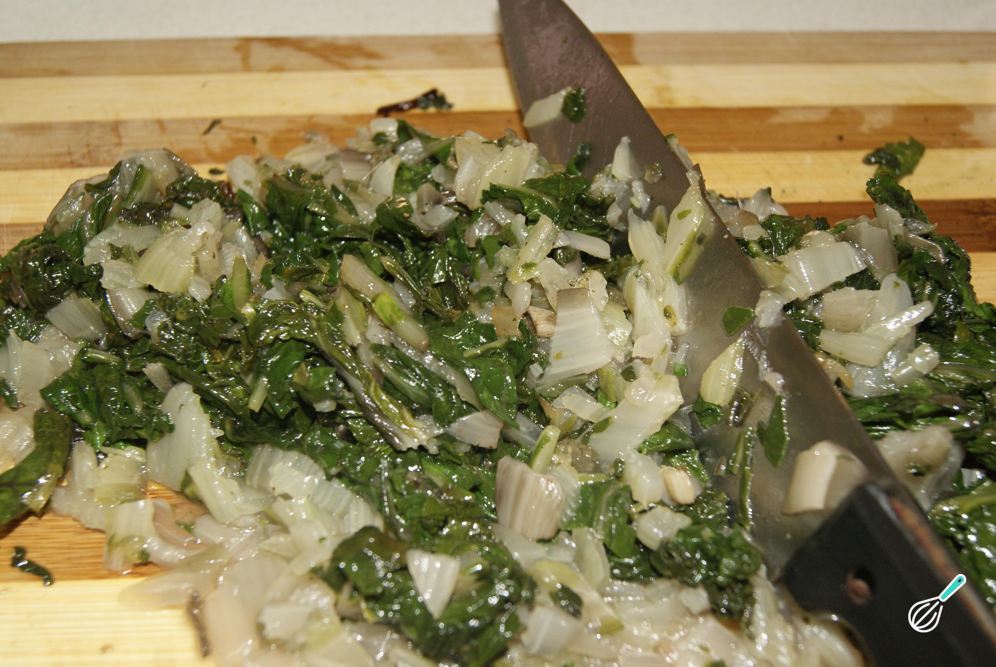 Enquanto refoga a cebola e o bacon, verifique se a acelga e os talos estão cozinhados. Caso estejam, retire-os e pique a acelga junto com os talos. Junte a verdura com a cebola e o bacon.