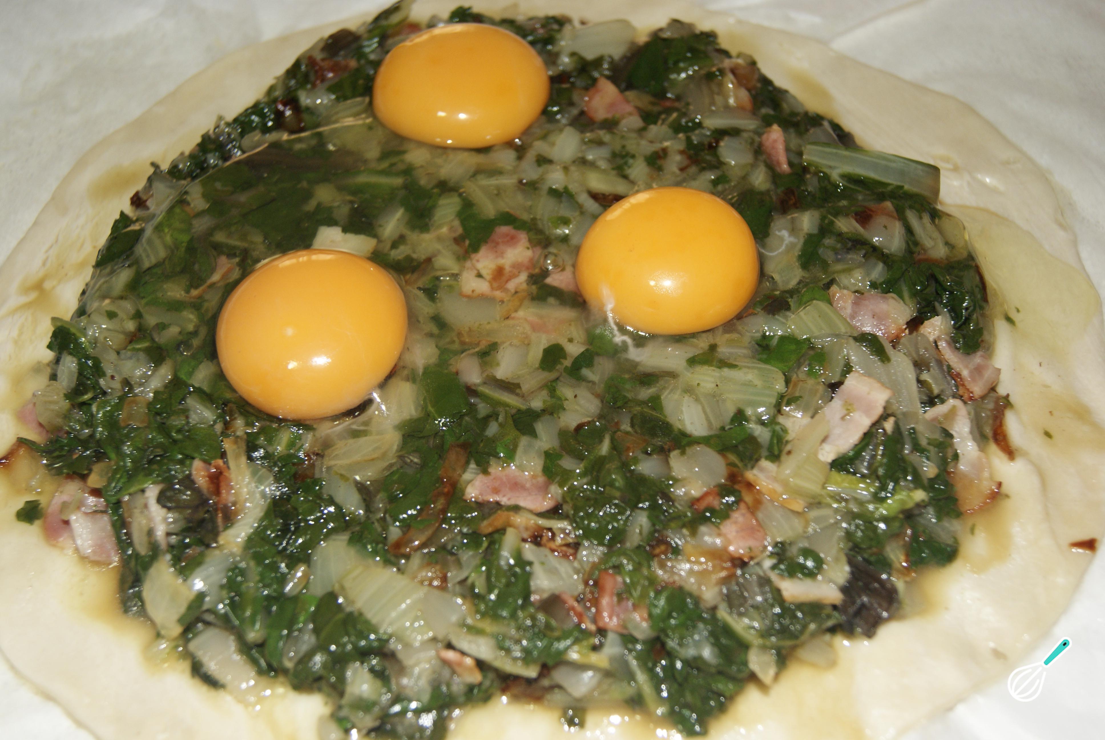 Estenda metade da massa quebrada sobre o papel manteiga e junte o recheio de acelga e bacon. Coloque 3 ovos por cima, como na fotografia.