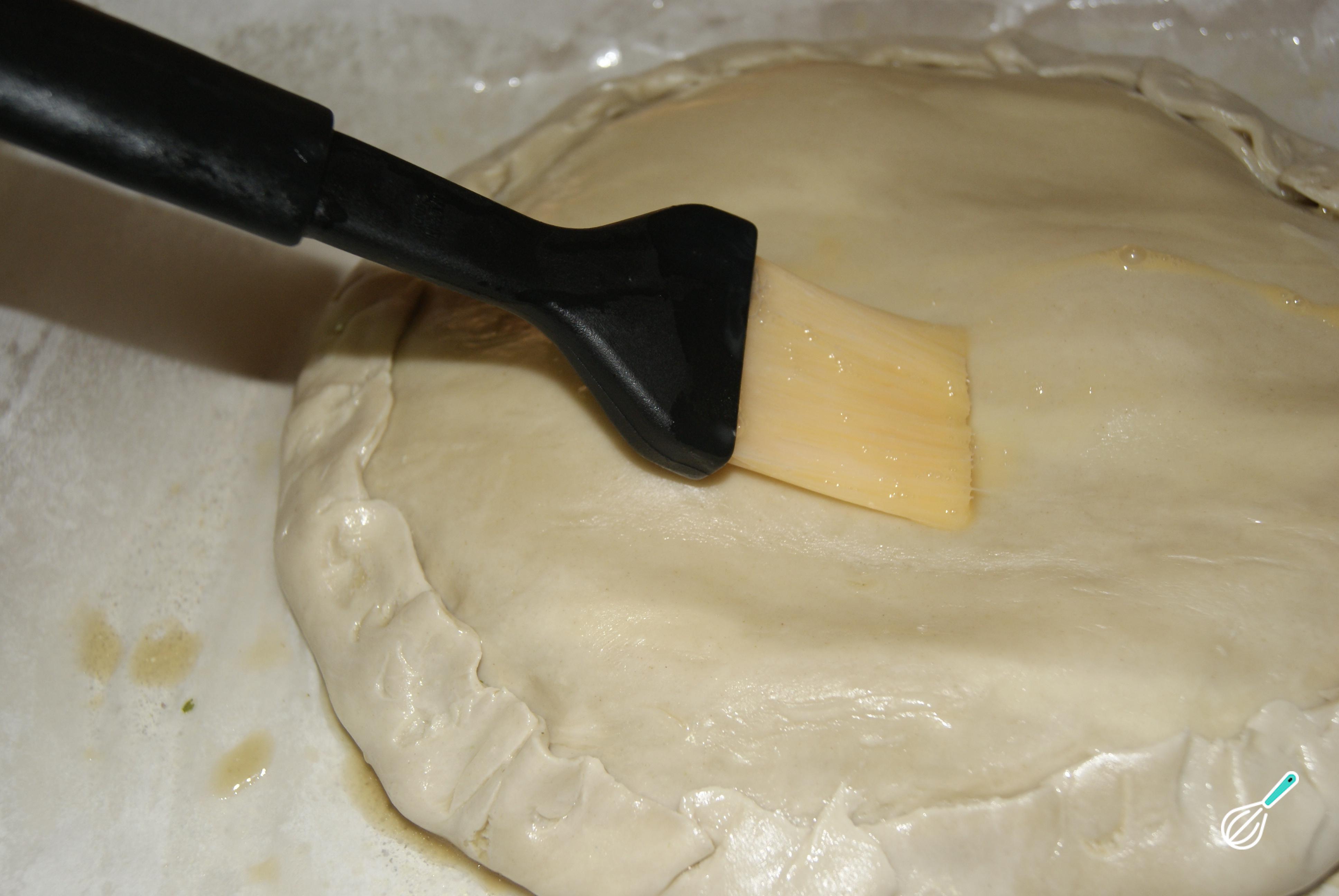De seguida, cubra com a outra metade da massa, selando bem as extremidades para impedir que o recheio saia, e pincele a massa com o ovo restante (previamente batido).