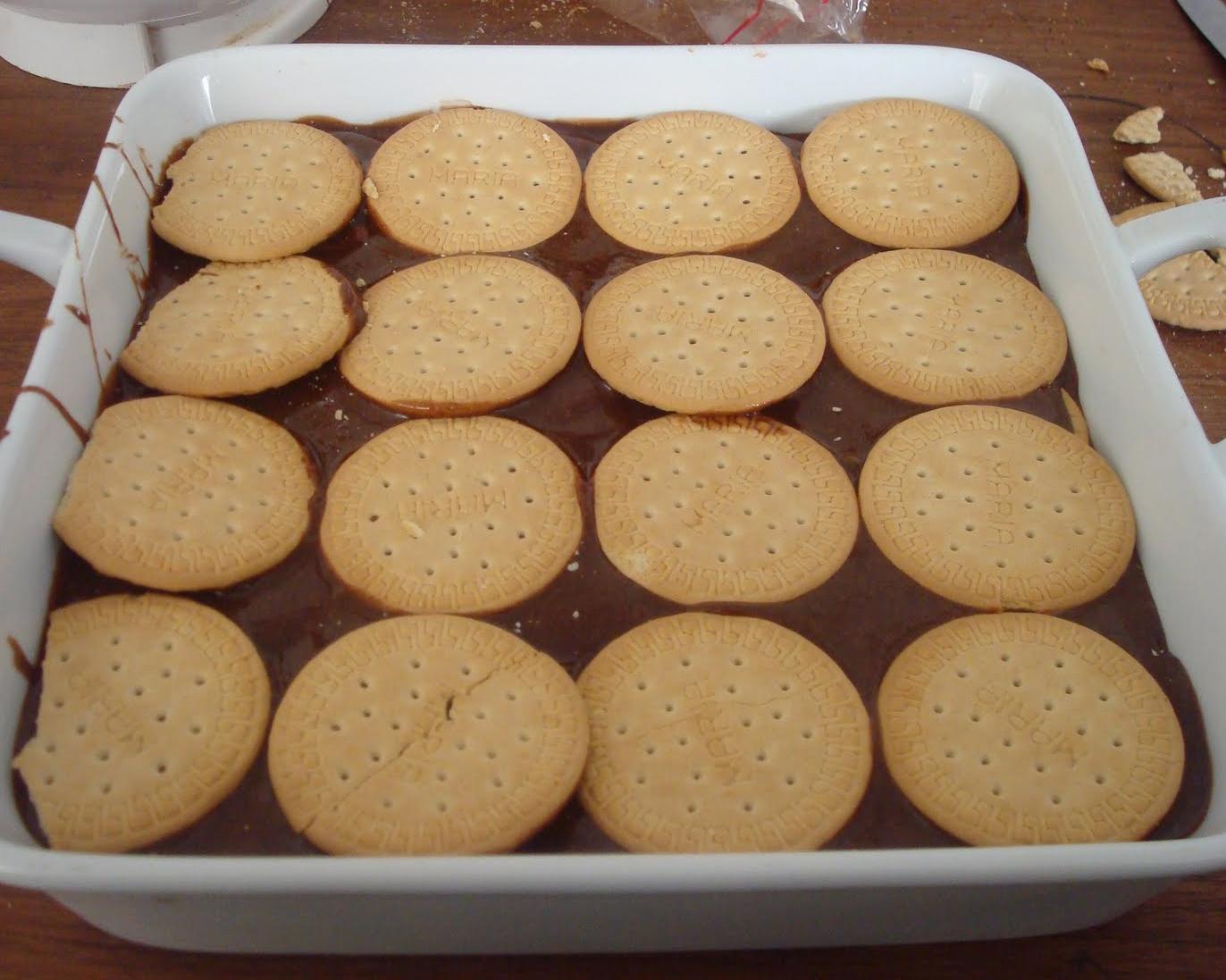 Numa travessa untada coloque uma camada do creme acima, cubra com uma camada de bolacha Maria, repita mais uma camada de creme e assim sucessivamente - a última camada deve ser de creme. Reserve na geladeira por, pelo menos, 2 horas.