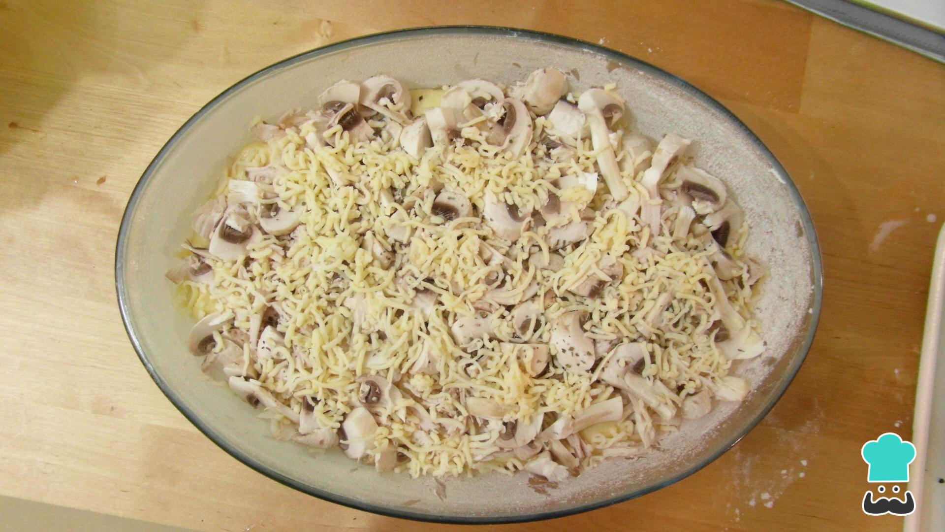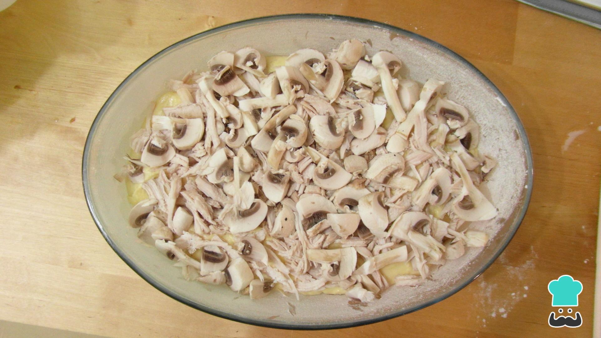 Espalhe a massa numa assadeira untada e enfarinhada. Cubra com o frango desfiado e os cogumelos.