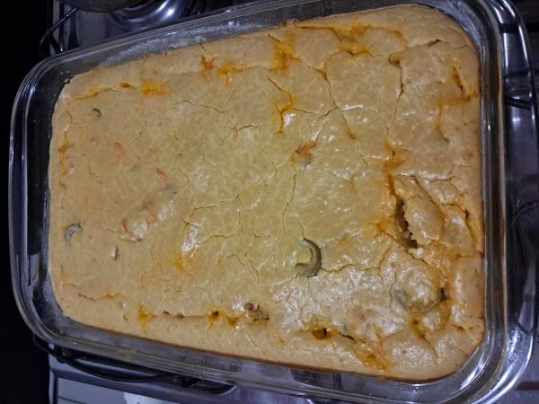 A torta ficou muito boa, fiz de cara 2 receitas em uma assadeira grande e saiu ótimo, só precisei deixar um pouco mais no forno até o palito sair limpo.